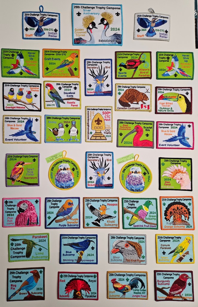 The Challenge Trophy Camporee Patches are popular collectables. We exceeded the 300 Patch Milestone (designs) at the 19th CTC in 2017. We have a few with 2 or 3 different colored & / or metallic borders, but we consider those as “one patch design”. Check out our collection below.