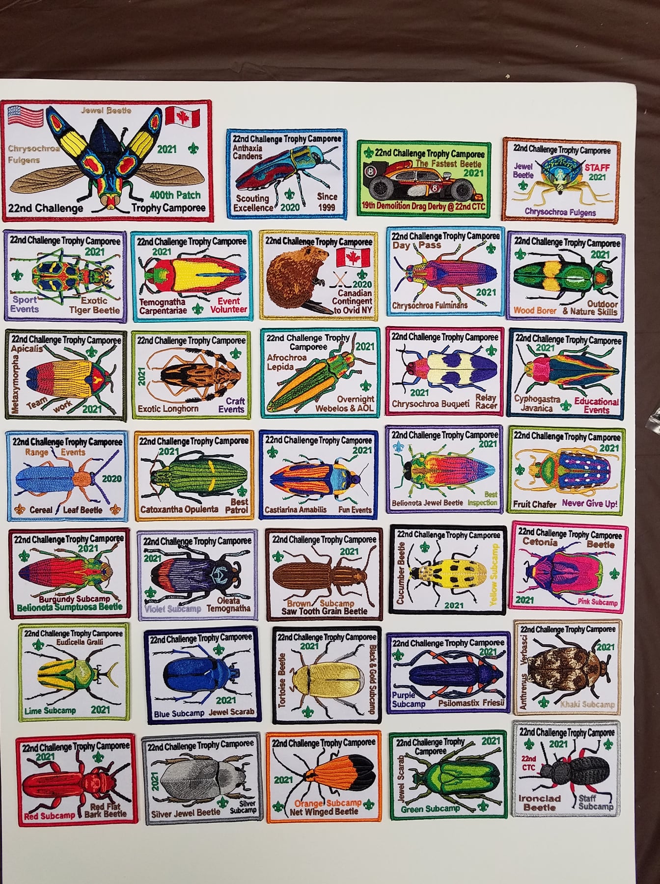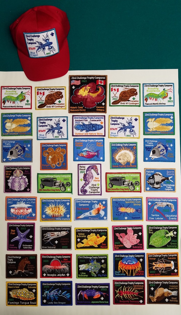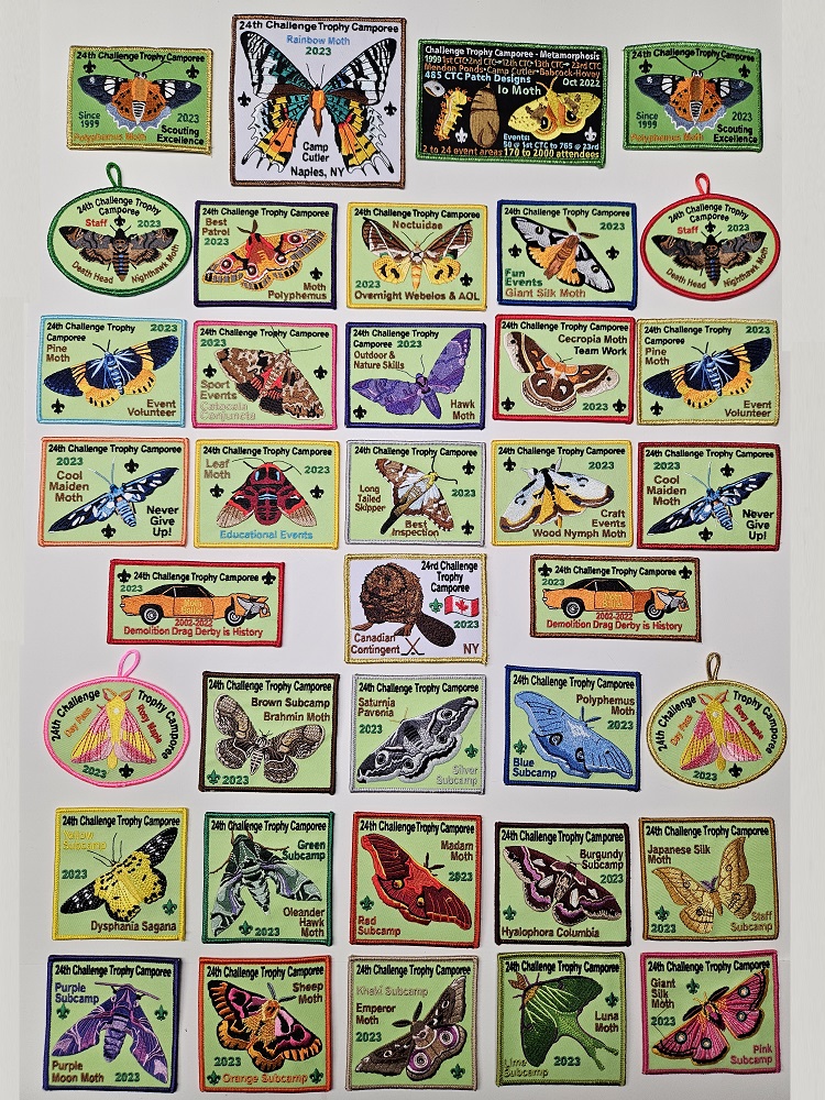 The Challenge Trophy Camporee Patches are popular collectables. We exceeded the 300 Patch Milestone (designs) at the 19th CTC in 2017. We have a few with 2 or 3 different colored & / or metallic borders, but we consider those as “one patch design”. Check out our collection below.